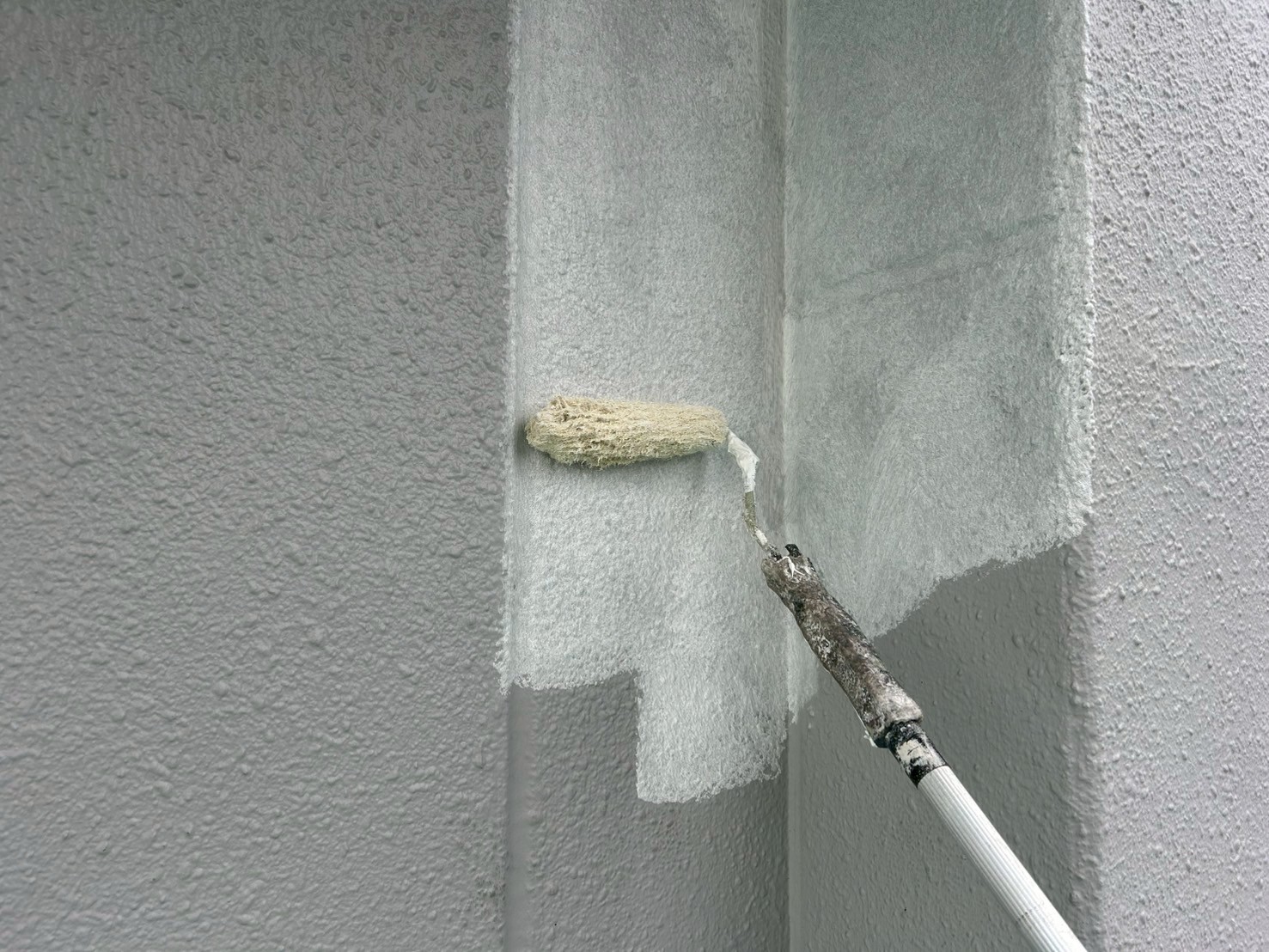 今回はモルタル外壁のため、モスタル専用の下塗り塗料(フィラー)を使用いたしました。