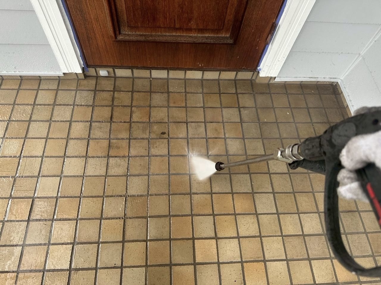 毎日出入りしている玄関も綺麗に洗い流します。また、基礎の部分はよく泥や苔などがついているため、しっかりと洗い流します。