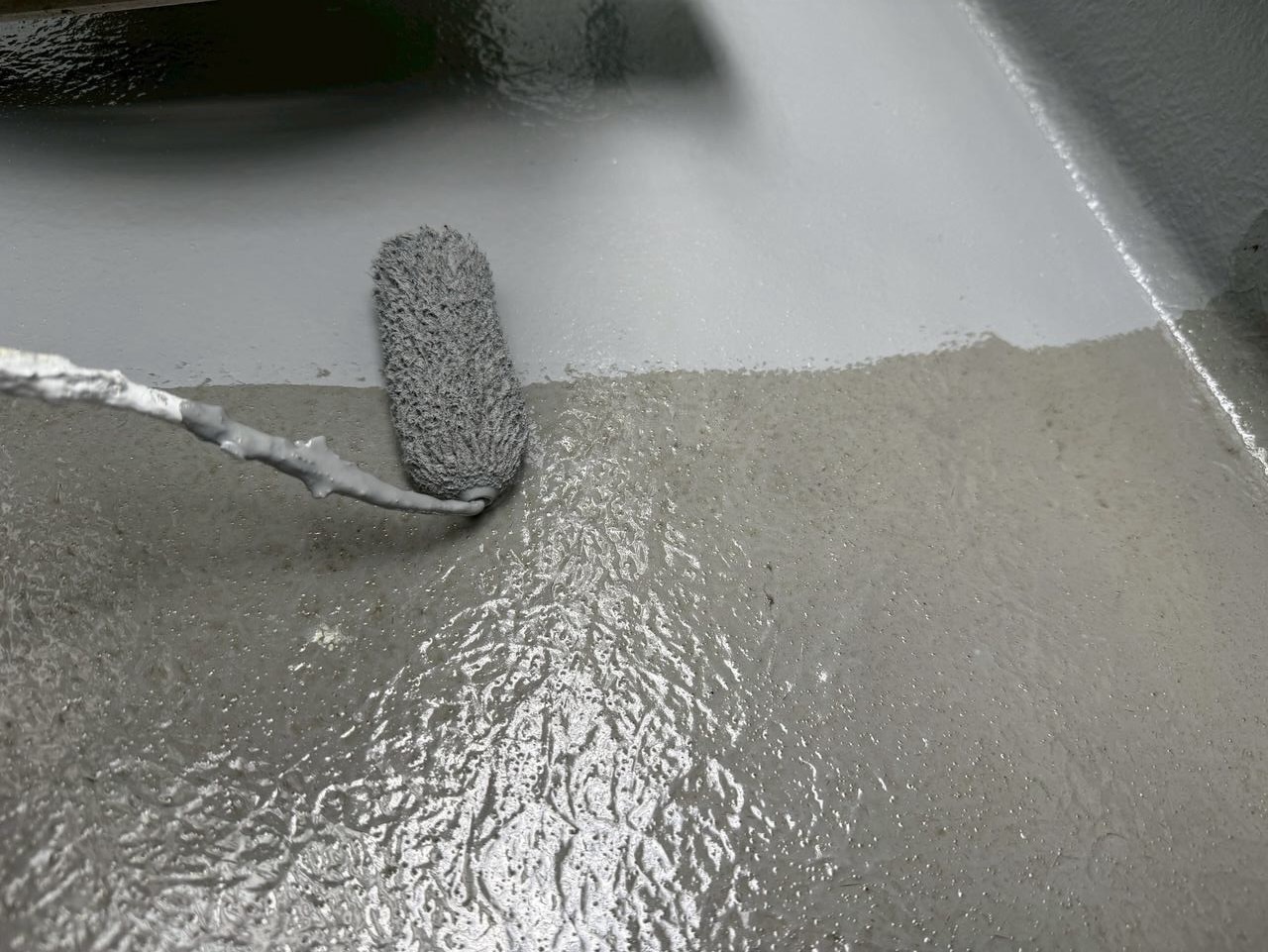 施工方法: 下地にウレタン樹脂を塗布し、乾燥させることで防水層を作ります。
