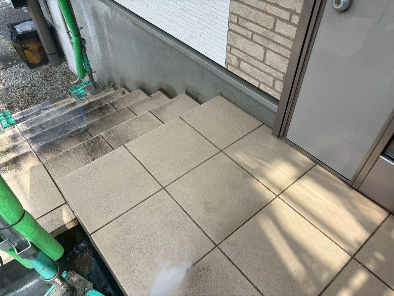 毎日出入りしている玄関も綺麗に洗い流します。また、基礎の部分はよく泥や苔などがついているため、しっかりと洗い流します。
