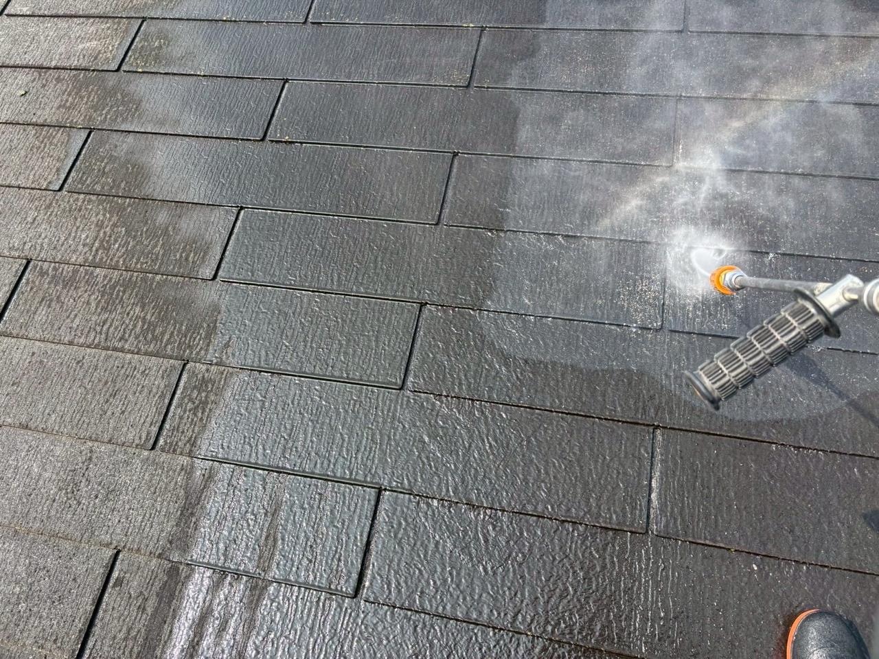 外壁塗装工事や屋根塗装工事では、塗装前(塗料を塗る前)に、高圧洗浄機を使用して、高圧の水で外壁に付着した汚れや傷んだ旧塗膜などを洗い流します。