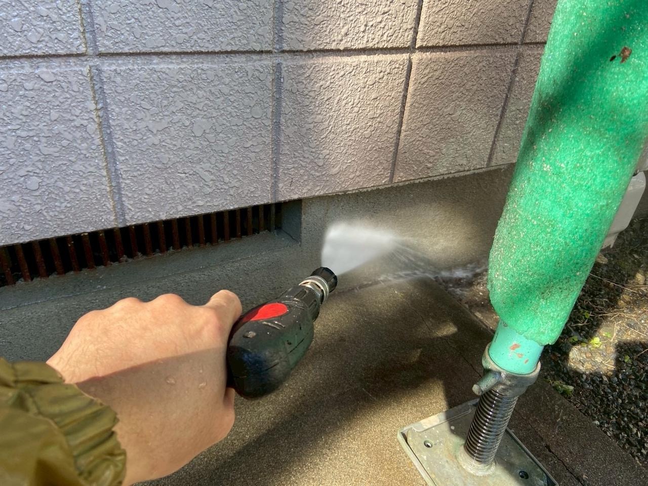 外壁塗装工事や屋根塗装工事では、塗装前(塗料を塗る前)に、高圧洗浄機を使用して、高圧の水で外壁に付着した汚れや傷んだ旧塗膜などを洗い流します。