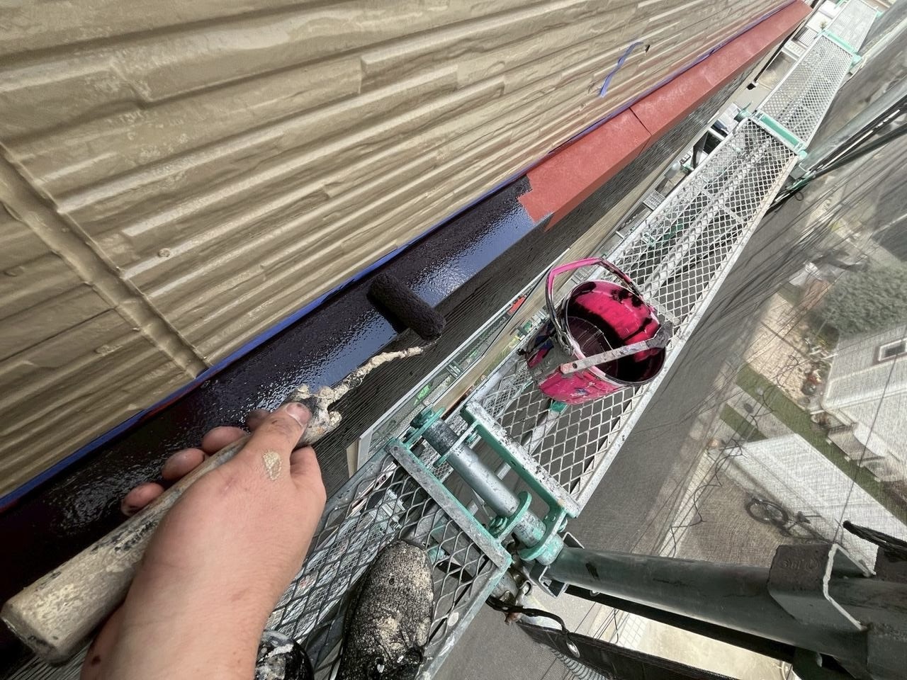 塗装1回目では下地を保護する塗料を使い、塗装2回目にも同じ塗料を用います。塗料の種類は色や価格などさまざまですが、鈴吉ペイントでは「アクリル塗料」、「シリコン塗料」または「フッ素系塗料」を使用します。