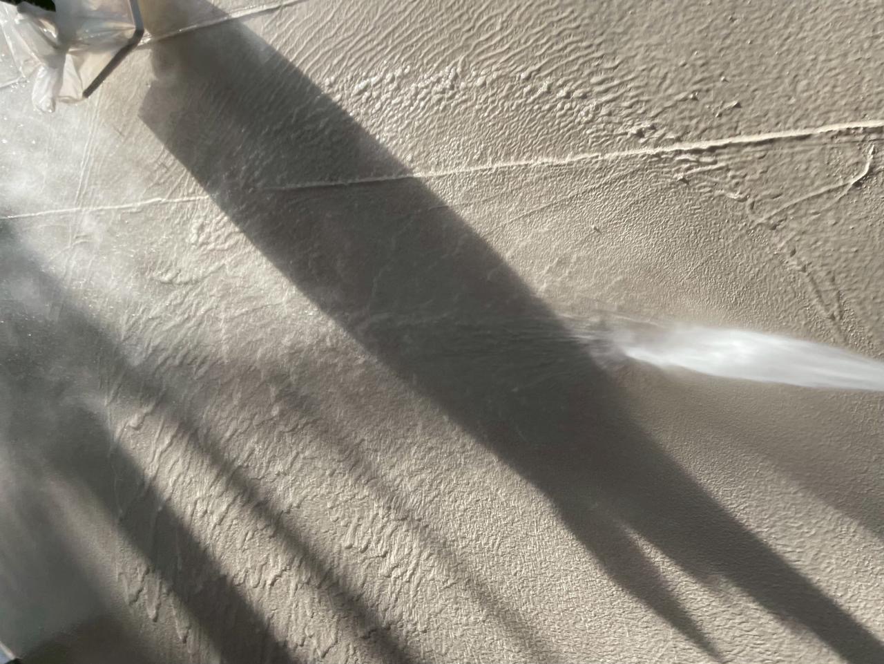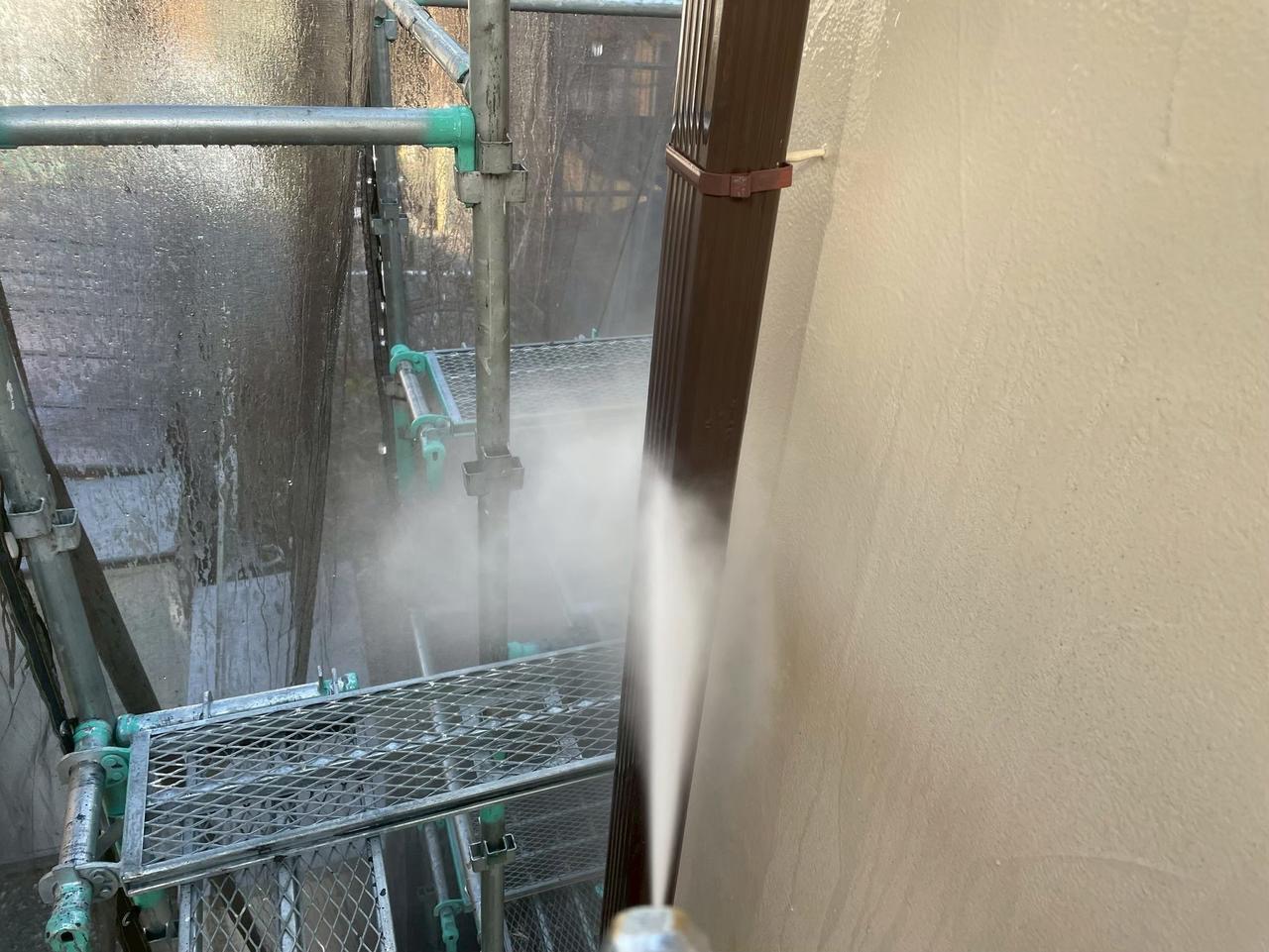 外壁塗装工事や屋根塗装工事では、塗装前(塗料を塗る前)に、高圧洗浄機を使用して、高圧の水で外壁に付着した汚れや傷んだ旧塗膜などを洗い流します。