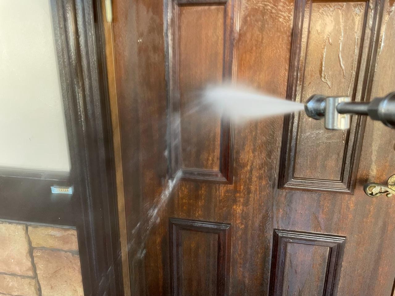 毎日出入りしている玄関も綺麗に洗い流します。また、基礎の部分はよく泥や苔などがついているため、しっかりと洗い流します。