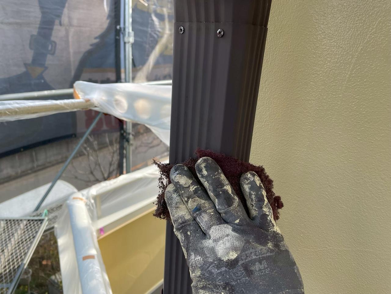 目粗しは、ケレンの程度が最も軽い状態の「ケレン4種」にあたる工程です。塗料の密着性を高めるのが主な目的で、鉄部の表面に細かな傷を付けることにより、塗料の接触面積を広げます。